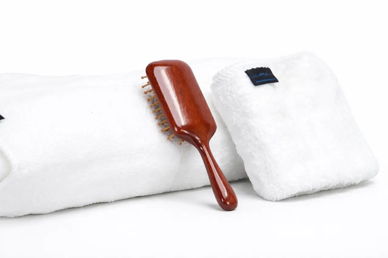 The UMI Headspa Bamboo Hair Brush combines natural materials with a nourishing effect for both hair and scalp. The smooth bamboo pins gently massage the scalp, stimulate blood circulation, and help distribute natural oils evenly through the hair.