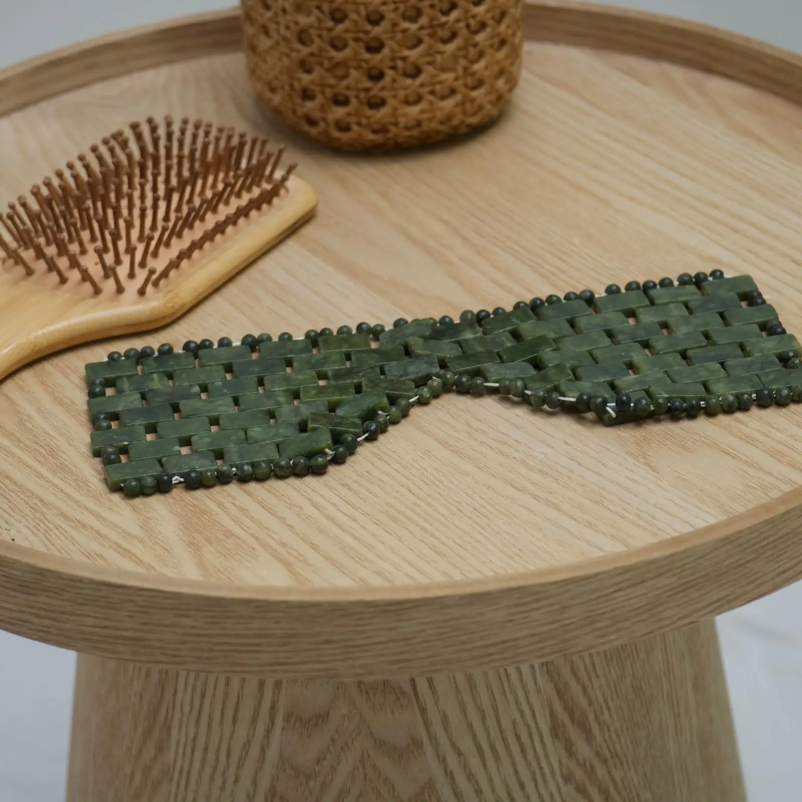 The Jade eye mask is made from smooth, natural jade and provides an immediate calming effect around your eyes. It helps reduce tension, soften under-eye bags, decrease swelling, and stimulate blood circulation.