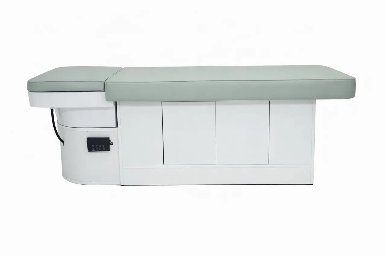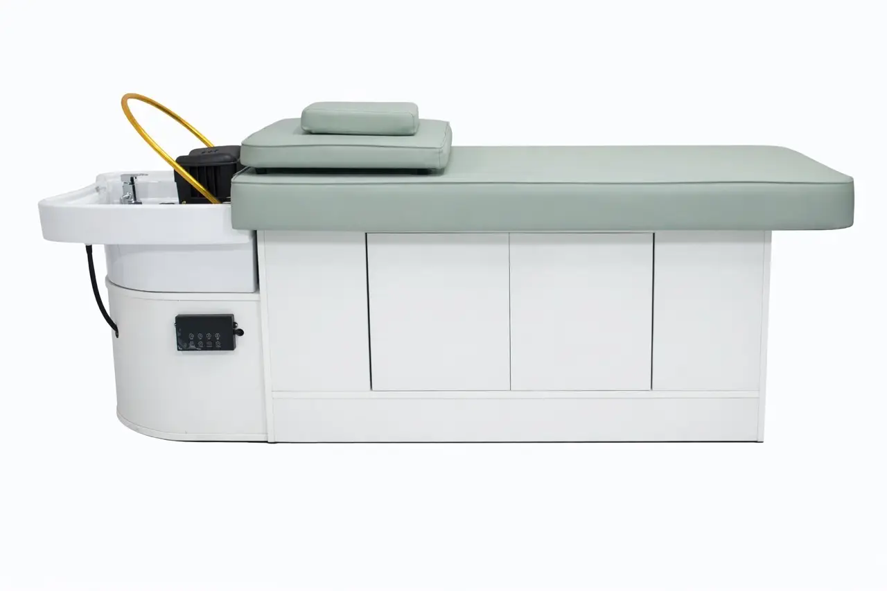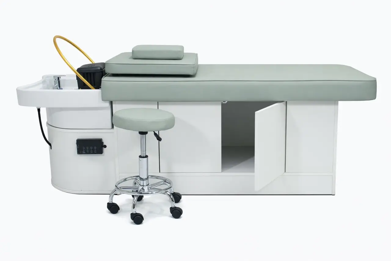 With your purchase, you also receive a steamer with steam hood, a cover panel, a small head cushion, and a height-adjustable stool in the same color as the bed. This means you immediately acquire one of the most complete head spa sets available and can start working professionally right away.