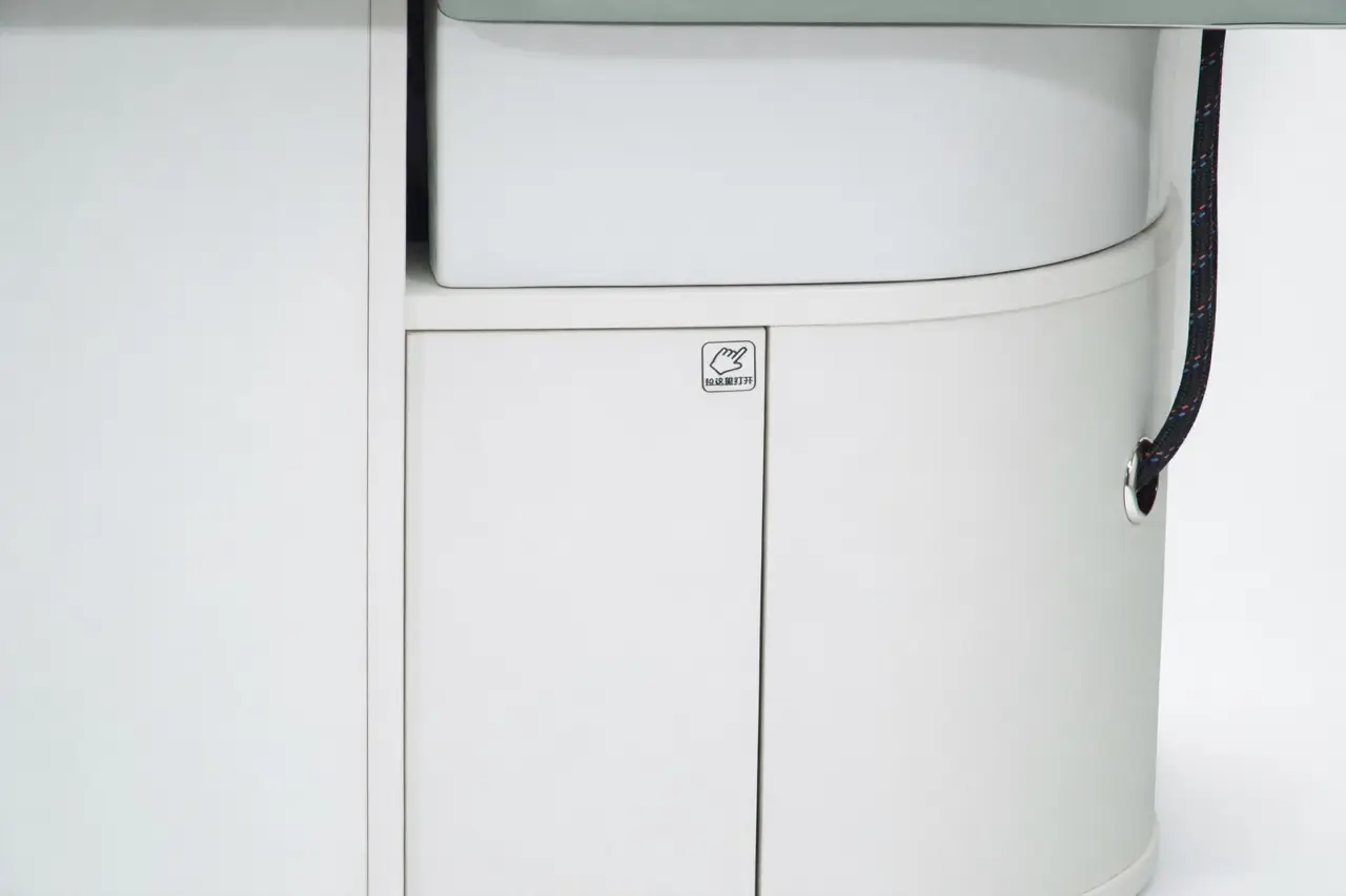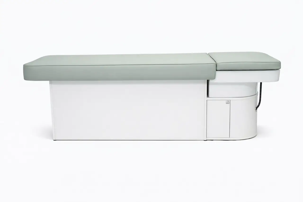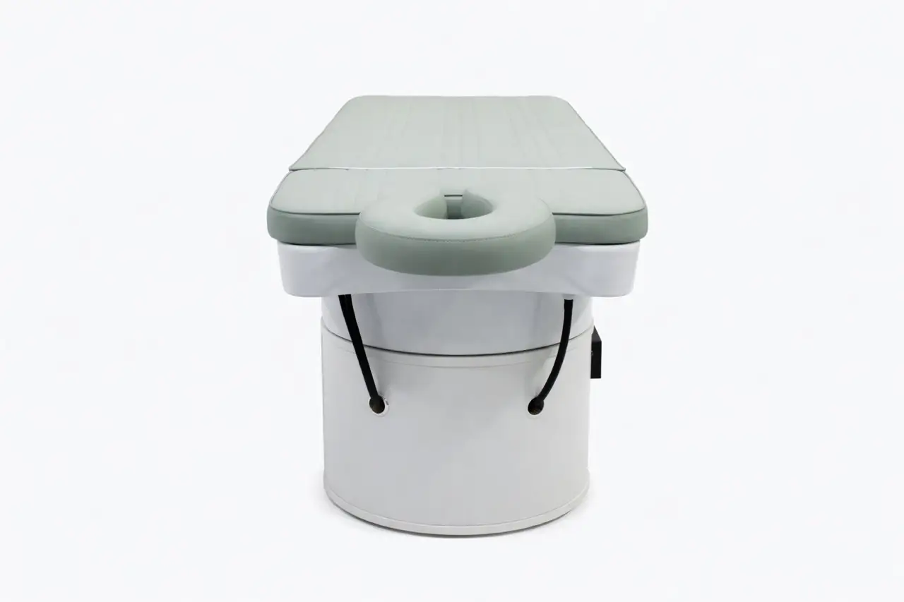The tap is also extremely user-friendly. Unlike many other head spa models, the Moto has only one water supply for both the hand shower and the rainfall shower. This means you no longer need to constantly search for the right temperature, allowing you to work faster, more easily, and more consistently during every treatment. The controls are simple and clear, which is why this bed is known as one of the most user-friendly head spa treatment beds available. Thanks to the cover panel, you can elegantly close off the bed, and the panel offers additional possibilities for massage and relaxation treatments with the included head cushion.