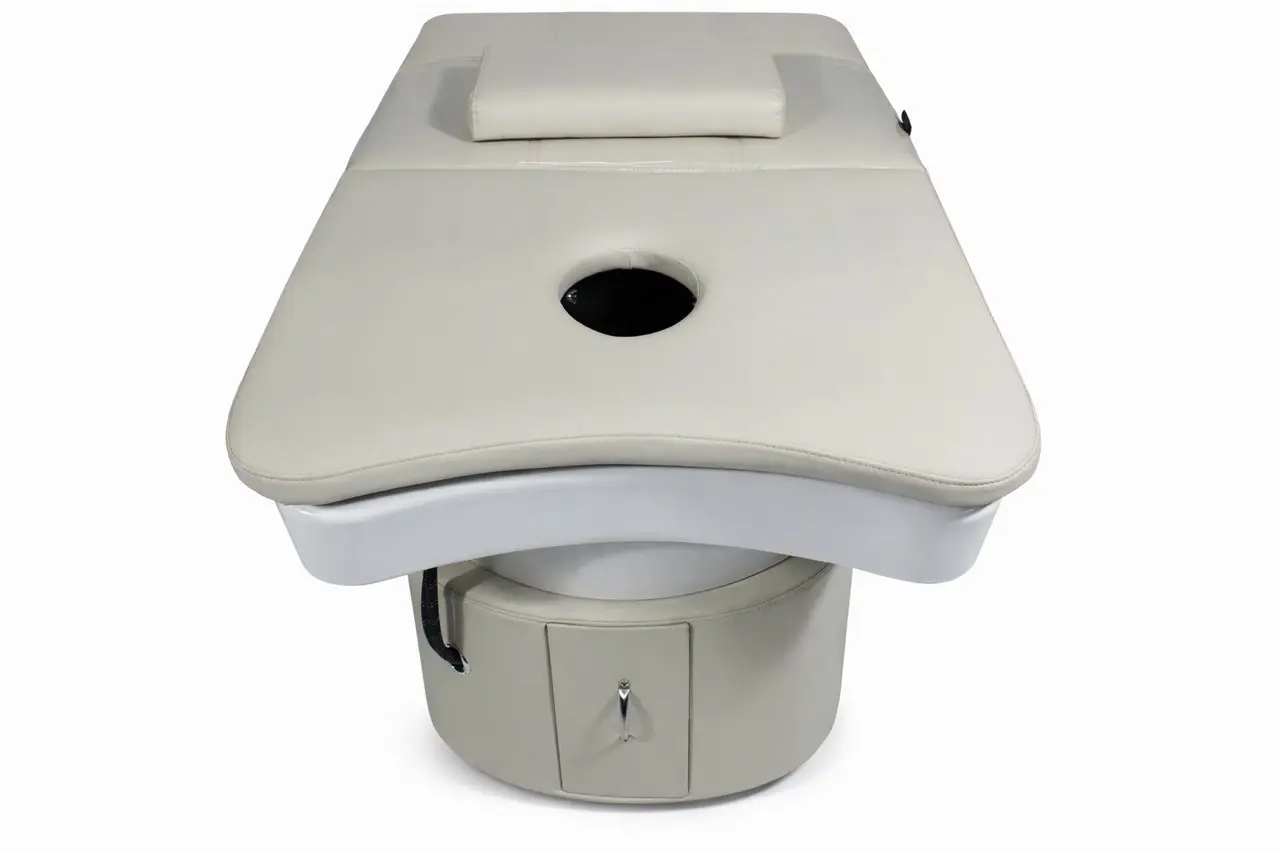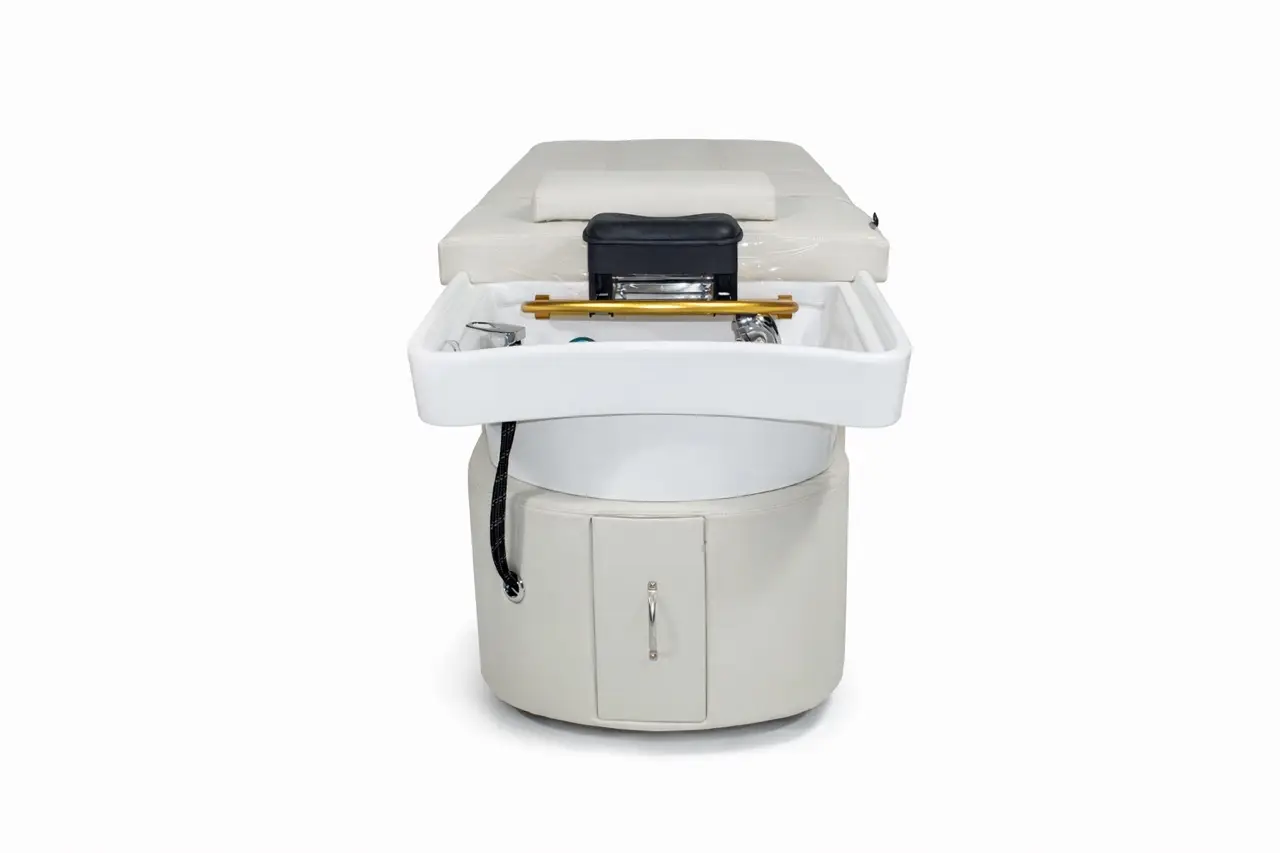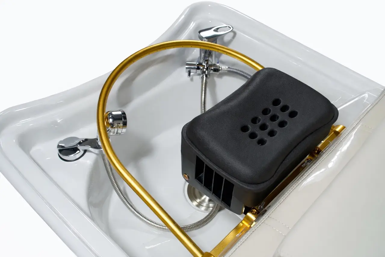 The UMI Headspa Bed Halo is designed for salons that want to elevate their interior and treatments to a higher level. This model focuses on appearance, experience, and refinement. The fully vegan leather upholstery gives the bed a soft, luxurious, and high-quality look that immediately stands out when a customer enters the room. The design exudes calm, class, and professionalism, fitting perfectly into exclusive salon and wellness concepts where ambiance and detail make the difference. An important luxury feature is the ceramic sink, known for its durability, hygiene, and scratch resistance. The integrated lighting in the sink creates a subtle, soothing glow during the treatment, enhancing the spa experience.
