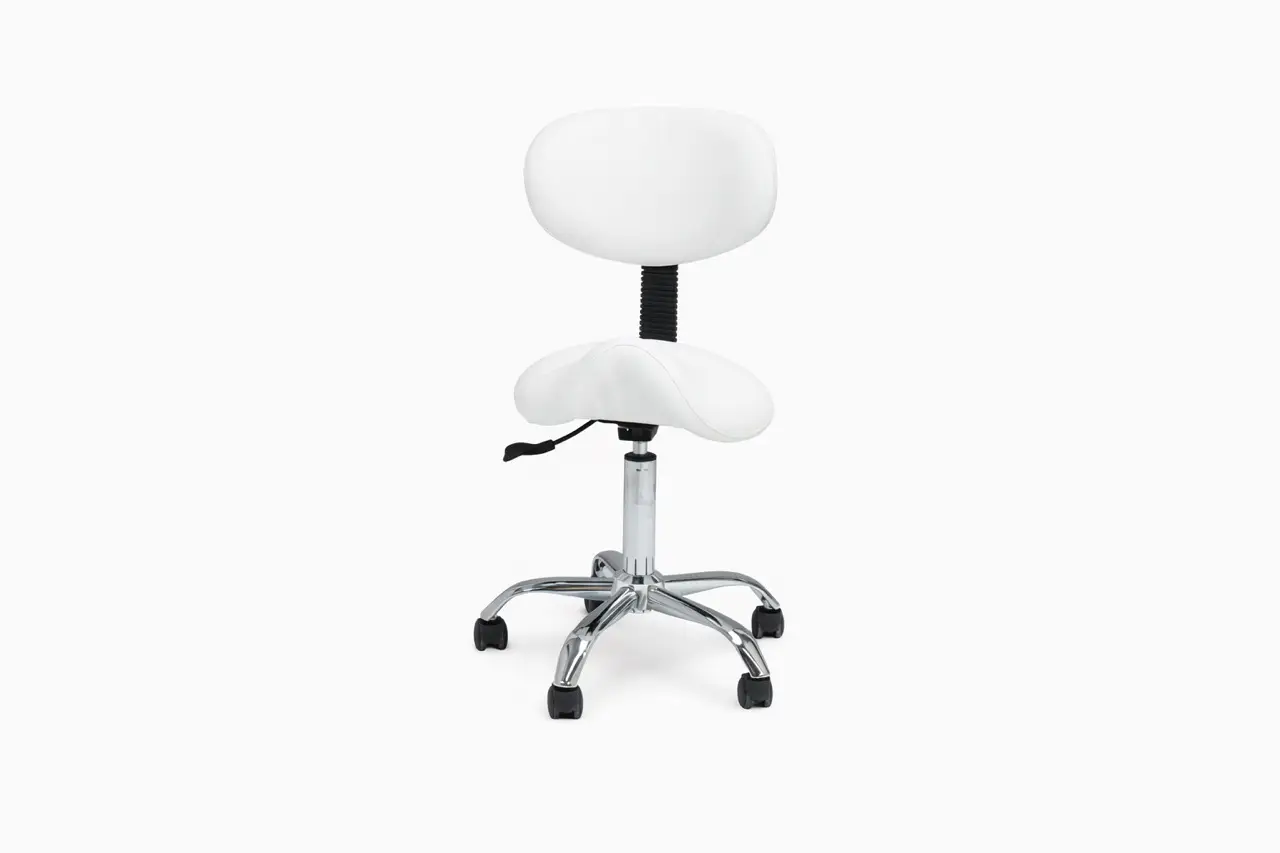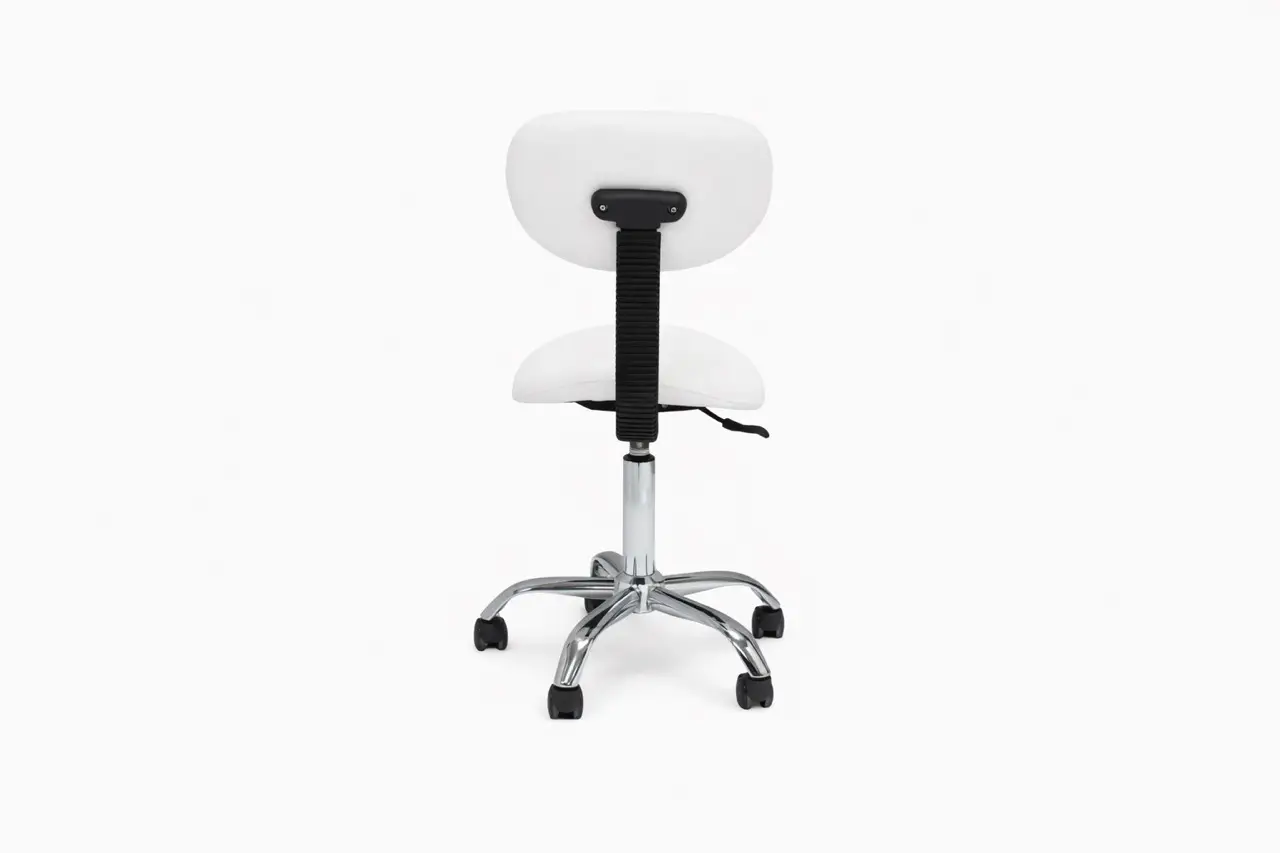 The addition of a backrest makes this model even more comfortable and supportive. During treatments where you move less or work in a fixed position for longer periods, the backrest provides extra stability and relieves the lower back. It helps reduce pressure on the spine and supports an upright yet relaxed posture. Especially during precise, detailed work that requires prolonged concentration, this support is of great value. The backrest reduces the need for constant active posture correction, saving energy and helping to prevent overstrain. This allows you to work comfortably for extended periods without early fatigue. The combination of a saddle-shaped seat and back support makes this stool suitable for a wide range of salon treatments, from facial treatments to cutting and styling work, and contributes to a stable and professional working posture.